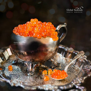 Las huevas de salmón son los huevos de color naranja rojizo y ligeramente transparentes que se encuentran en el interior del vientre de las hembras de salmón. El tamaño de las huevas puede variar según la especie, desde cinco milímetros en el caso de las huevas de salmón rojo hasta alrededor de un centímetro en el caso de las huevas de salmón chum . Las huevas de salmón de buena calidad tienen un aspecto brillante, una textura firme y están repletas de proteínas dietéticas, vitaminas y ácidos grasos omega-3 esenciales. Se las conoce con varios nombres, como ikura, huevas de salmón ikura o simplemente caviar rojo.